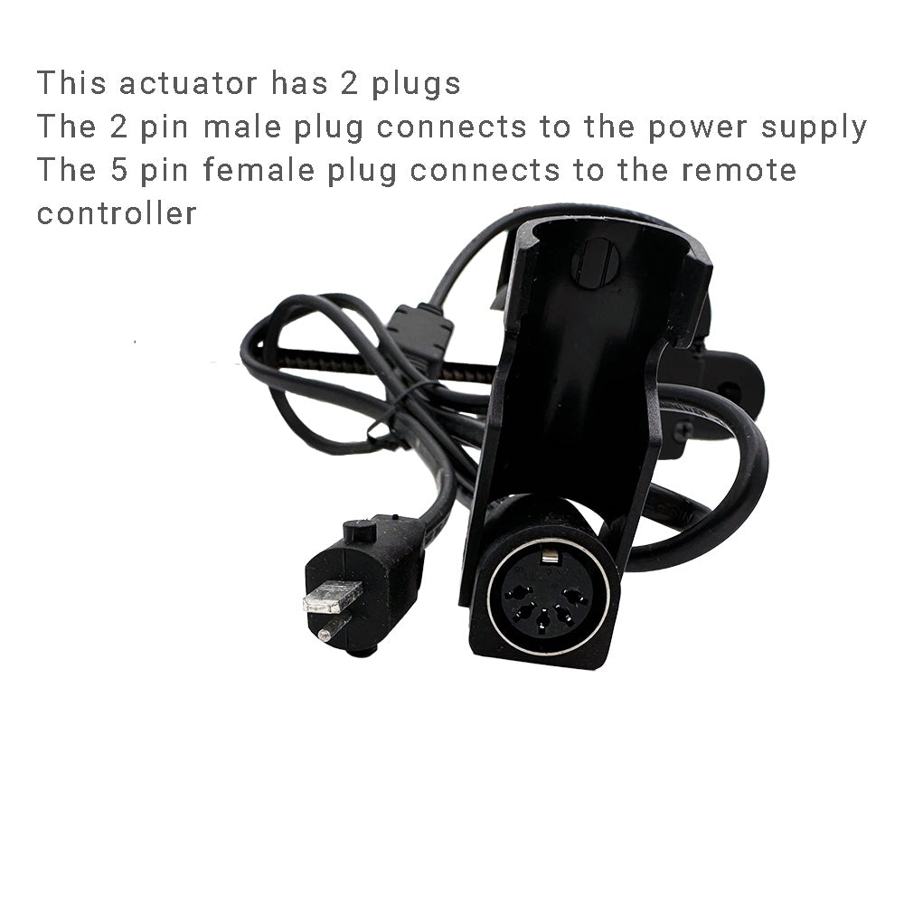 - This actuator has TWO cable & plug: a round 5 pin female plug connects to the remote controller, a 2-pin male plug connects to the power adapter.