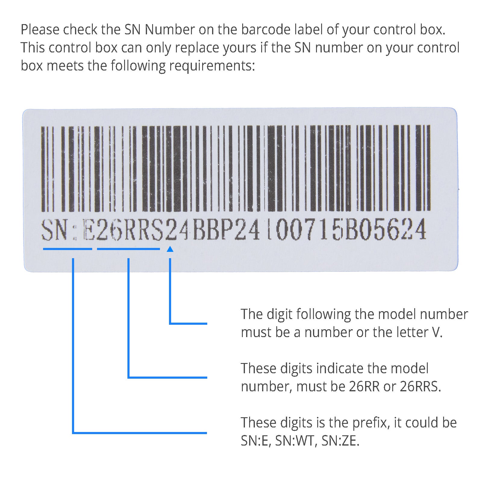 This control box is not cross-compatible. Please verify the SN number on the barcode sticker of the control box, and only order if the SN number matches the following criteria: