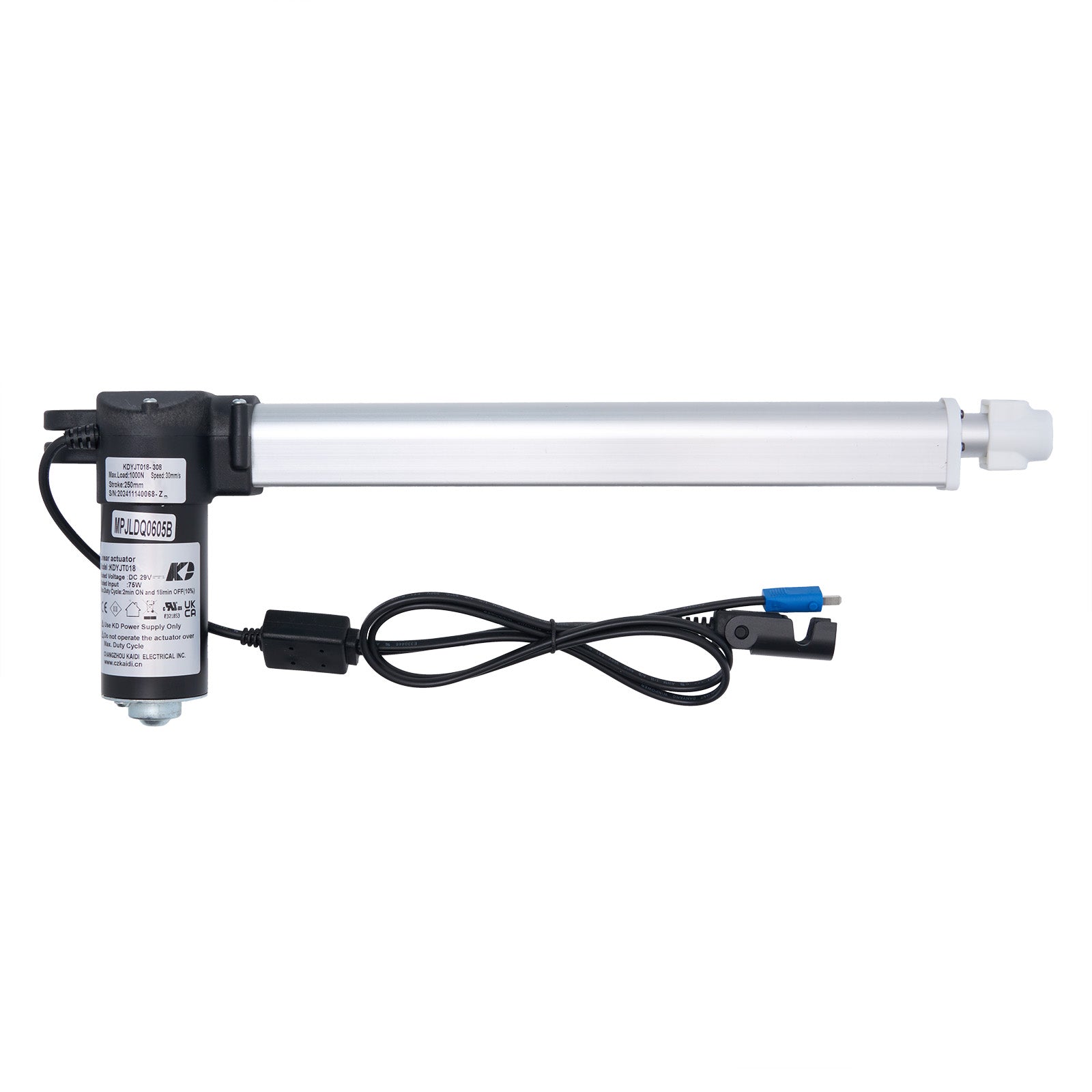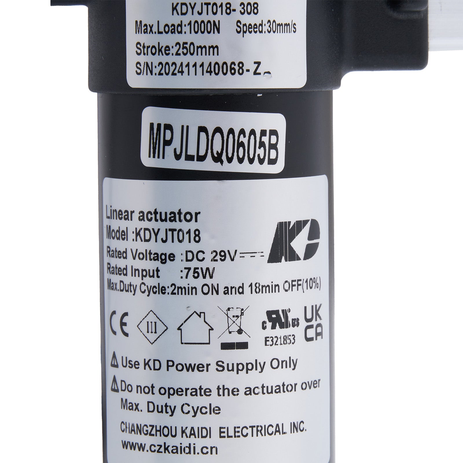 This is the genuine KAIDI KDYJT018-308 linear actuator, manufacturer part number MPJLDQ0605B.