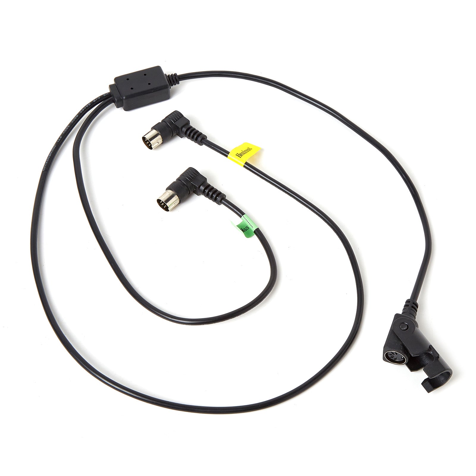- This cable has a female 5-pin plug on one side, and two right-angled (90°) 5-pin male plugs on the other side.