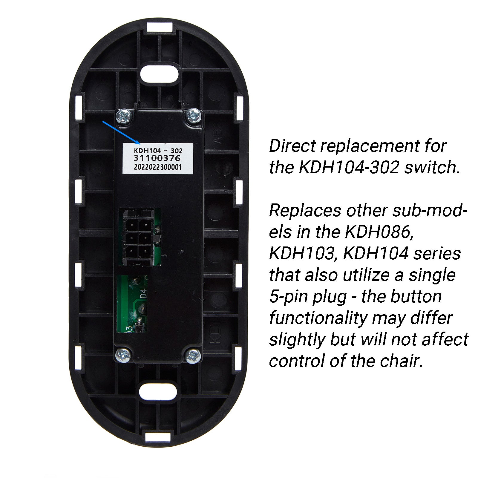- Replaces other sub-models in the KDH086, KDH103, KDH104 series that also utilize a single 5-pin plug - the button functionality may differ slightly but will not affect control of the chair.