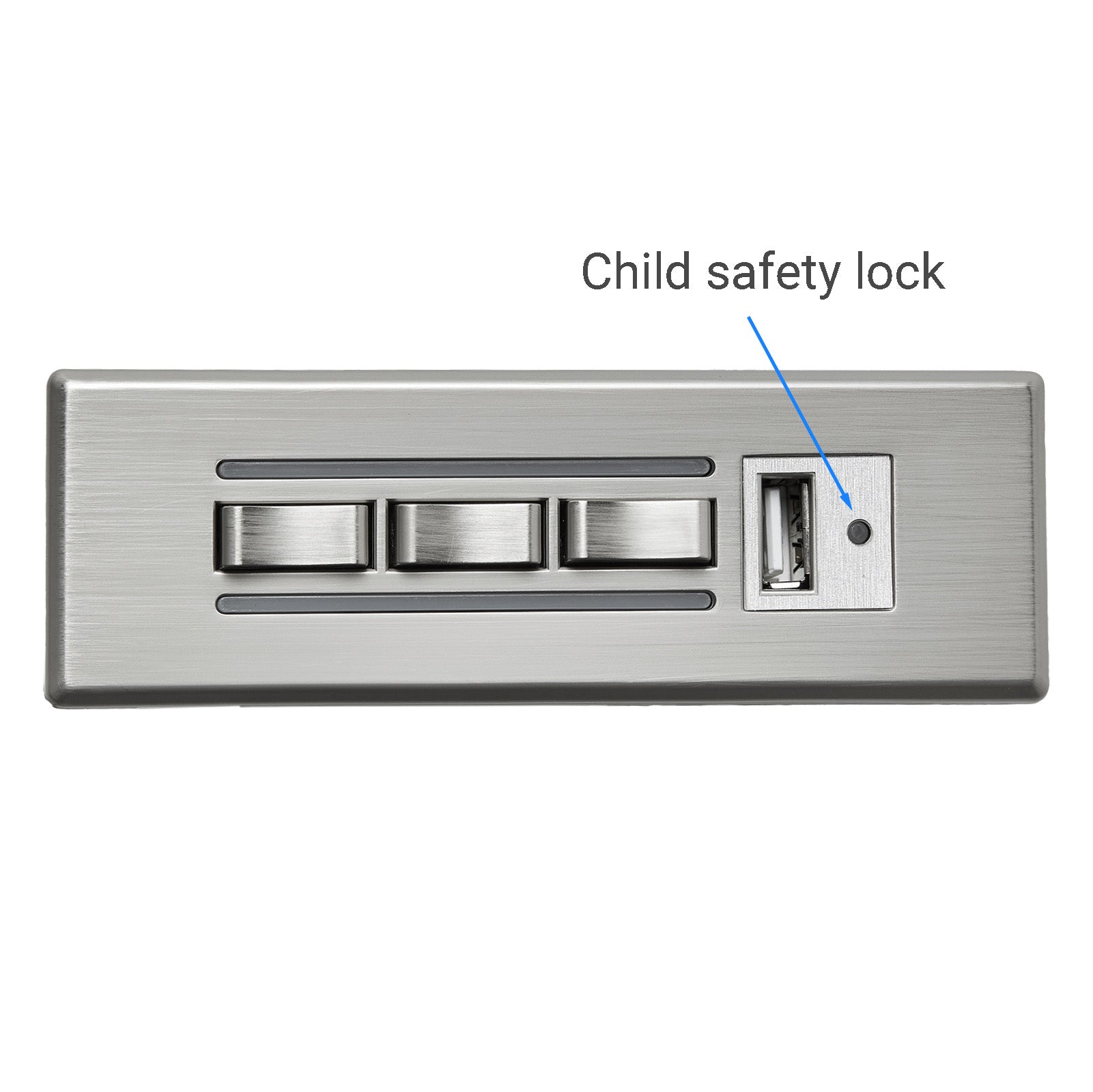 - Child safety lock: A small button near the USB port disables the six main buttons to prevent accidental activation by children.
