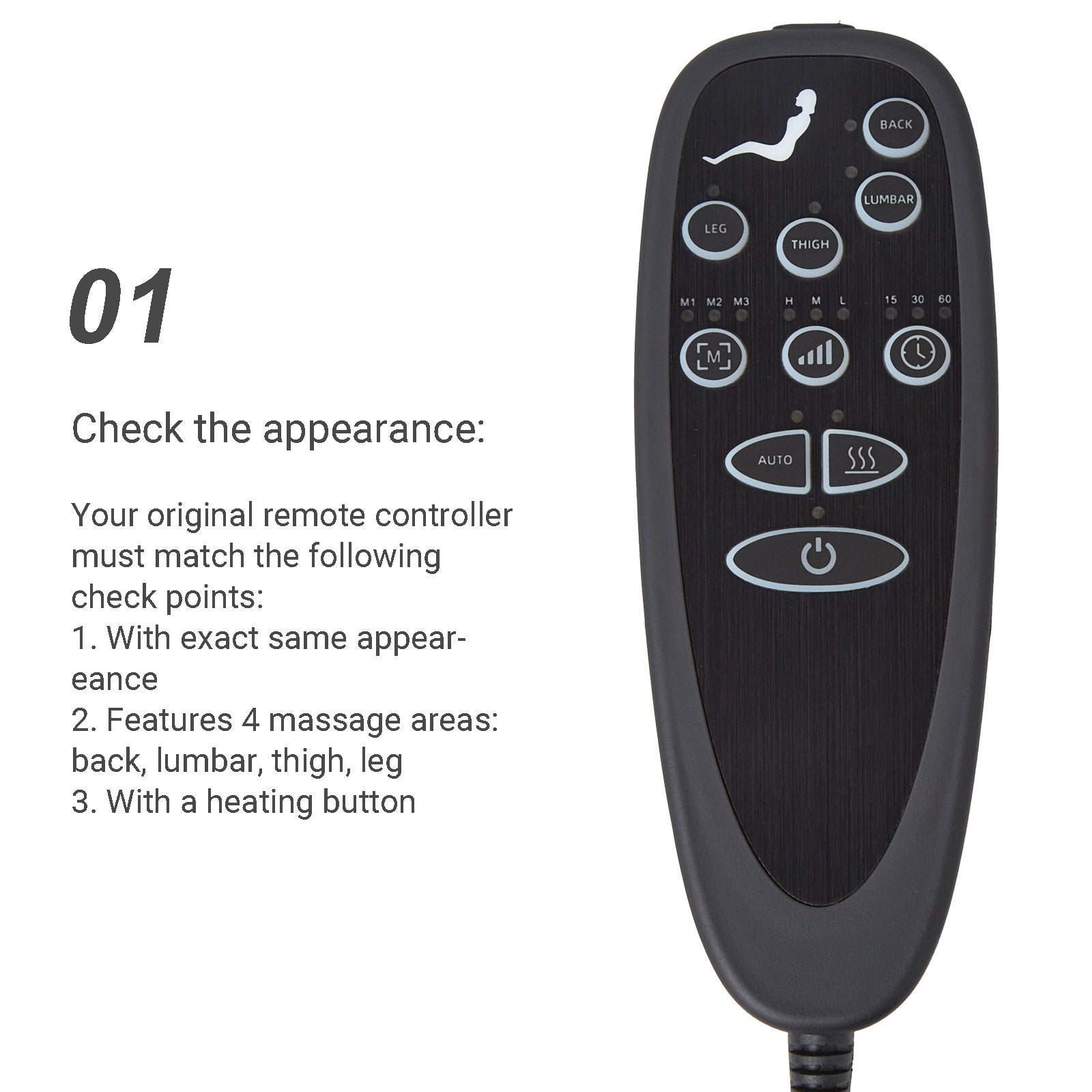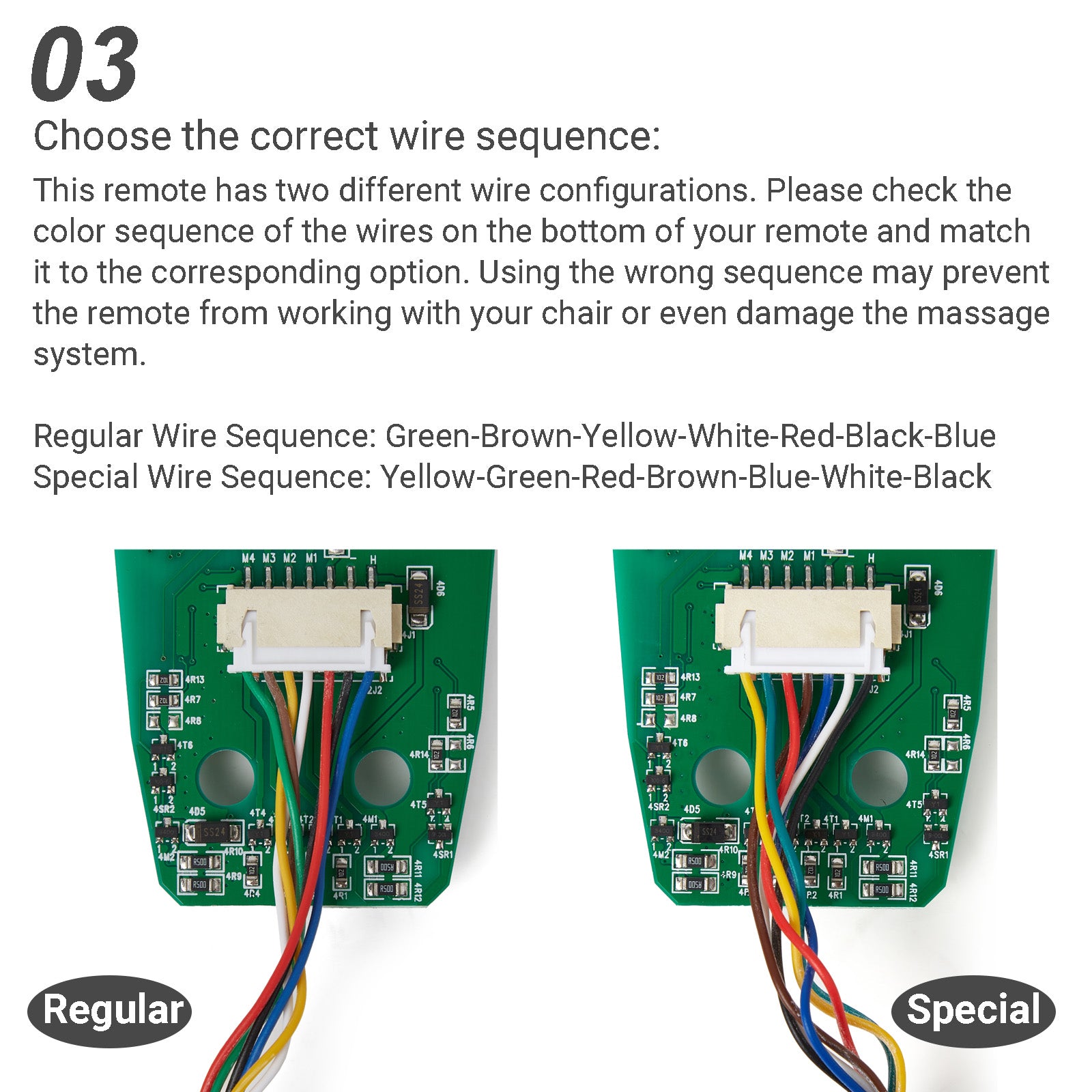 - This remote has two different wire configurations. Please check the color sequence of the wires on the bottom of your remote and match it to the corresponding option. Using the wrong sequence may prevent the remote from working with your chair or even damage the massage system.