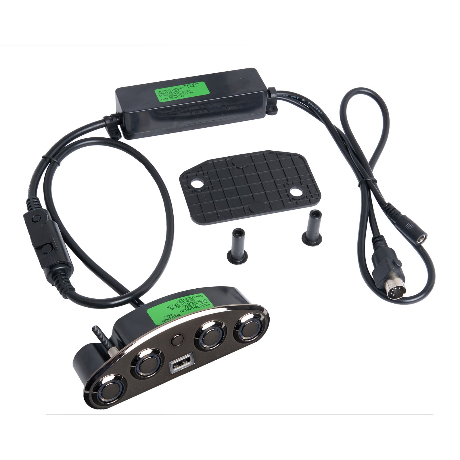 - A wire harness with a junction box that connects with the switch on one side and divides to a male 5-pin and a DC plug on the other end.