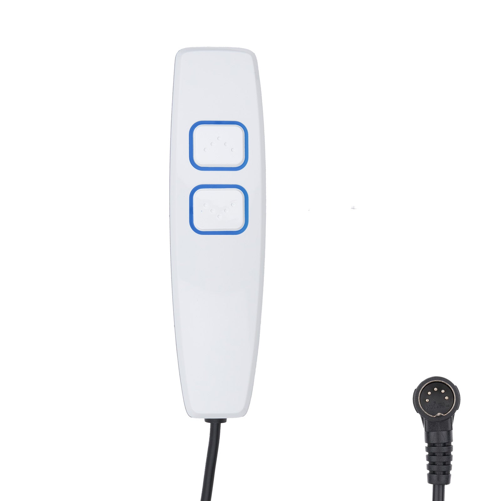 Authentic RMT23300147X000 remote controller. Features an ivory white front surface and grey back surface. Includes two large backlit buttons and uses a right-angled 5-pin plug, suitable for power recliners or lift chairs with a single motor.