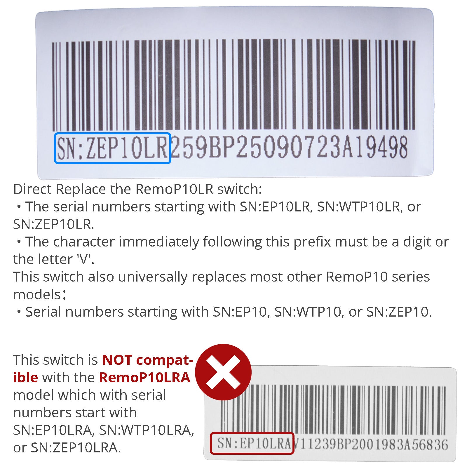 - This switch is NOT compatible with the RemoP10LRA model which with serial numbers start with SN:EP10LRA, SN:WTP10LRA, or SN:ZEP10LRA.