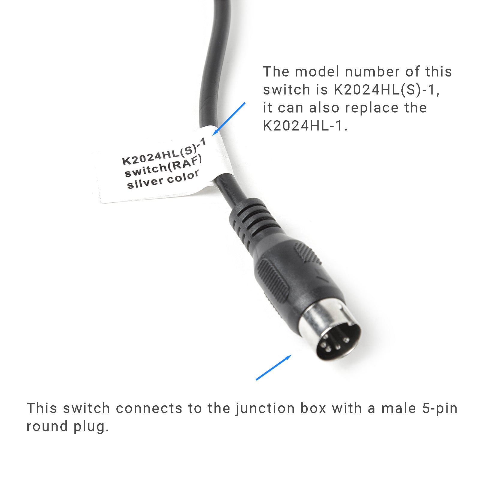 • Male 5-pin round plug: this switch connects to the junction box with a male 5-pin round plug.