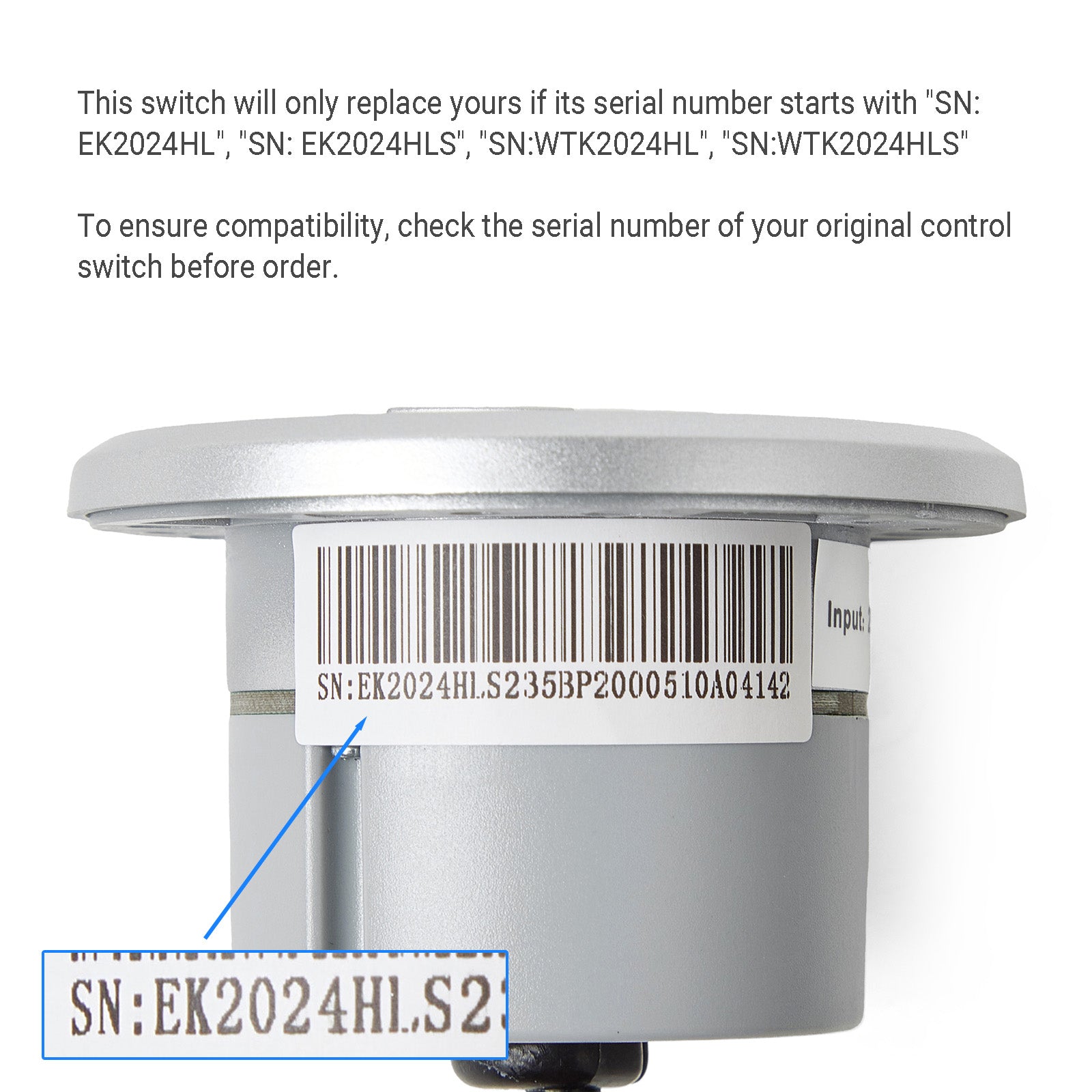 • You can determine if this switch can replace yours by checking the serial number of your switch.  This control switch will only replace your original switch if its serial number of your switch starts with "SN: EK2024HLS", "SN: EK2024HL", "SN: WTK2024HLS", Or "SN: WTK2024HL".