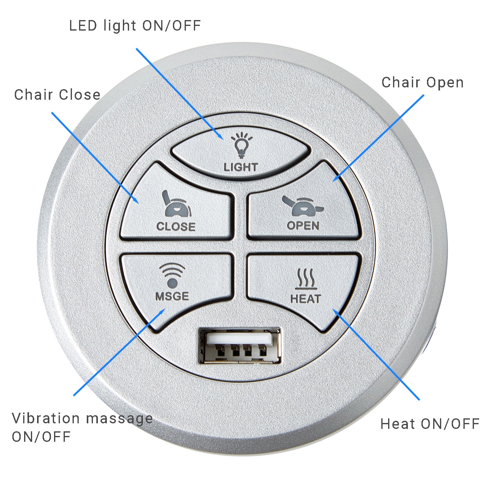 • Five buttons for controlling chair Open/Close and ON/OFF of the LED light, vibration massage, and heating.
