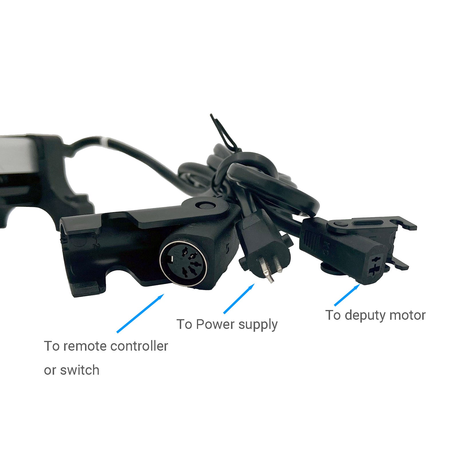 - This actuator has three cables and plugs, the male 2 pin plug connects to the power adapter, the female 5 pin plug connects to the remote controller/switch, two 2-pin female plug connects to the deputy motor (usually for headrest)