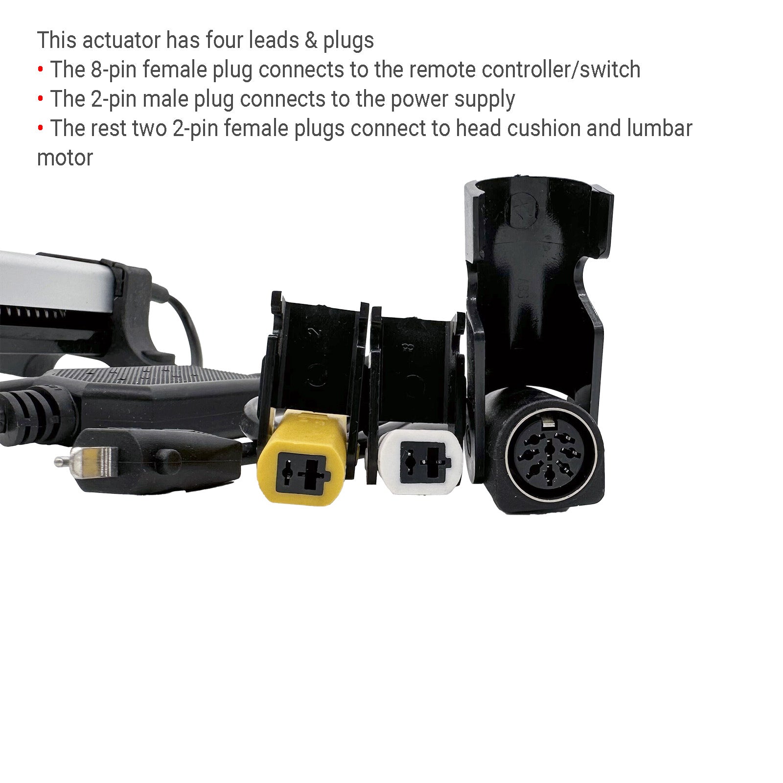- The KDPT007-241 linear actuator has four leads, a 2-pin male plug connects to the power supply, two 2-pin female plugs connect to the head and lumbar motor, and an 8-pin plug connects to the remote controller.