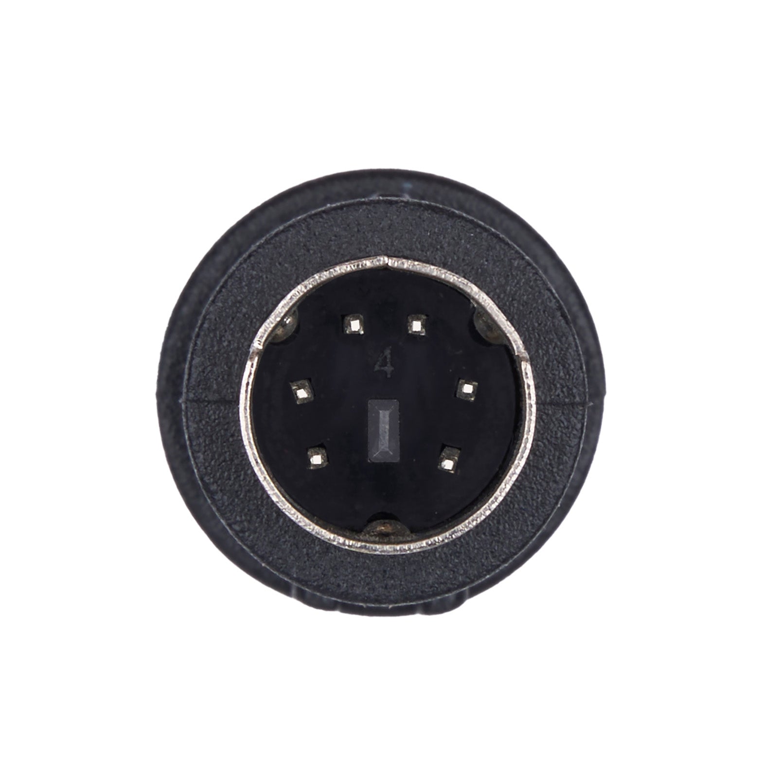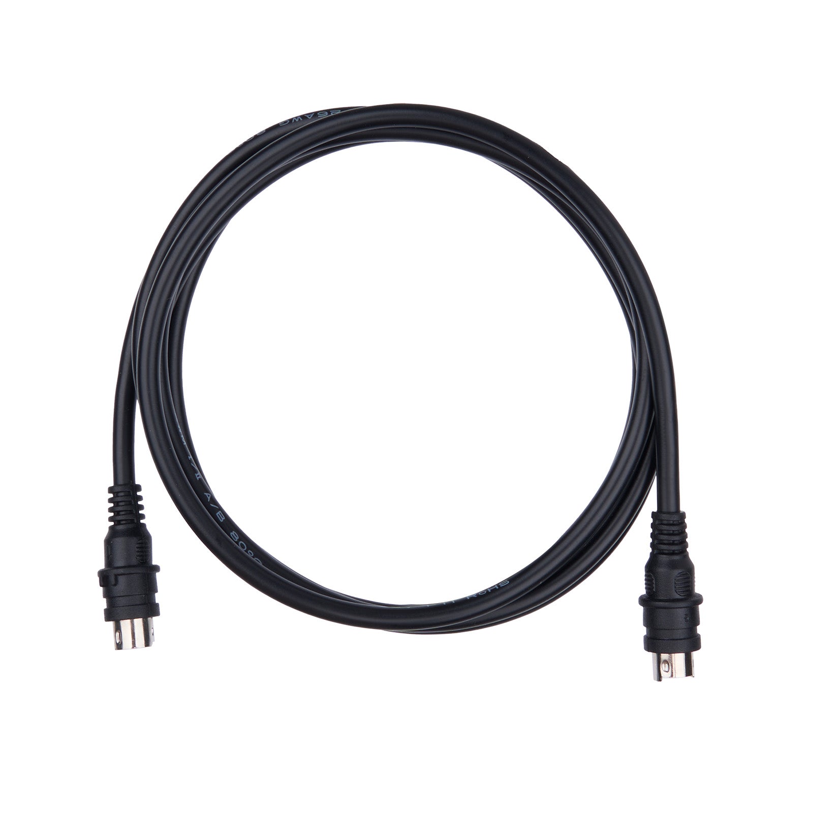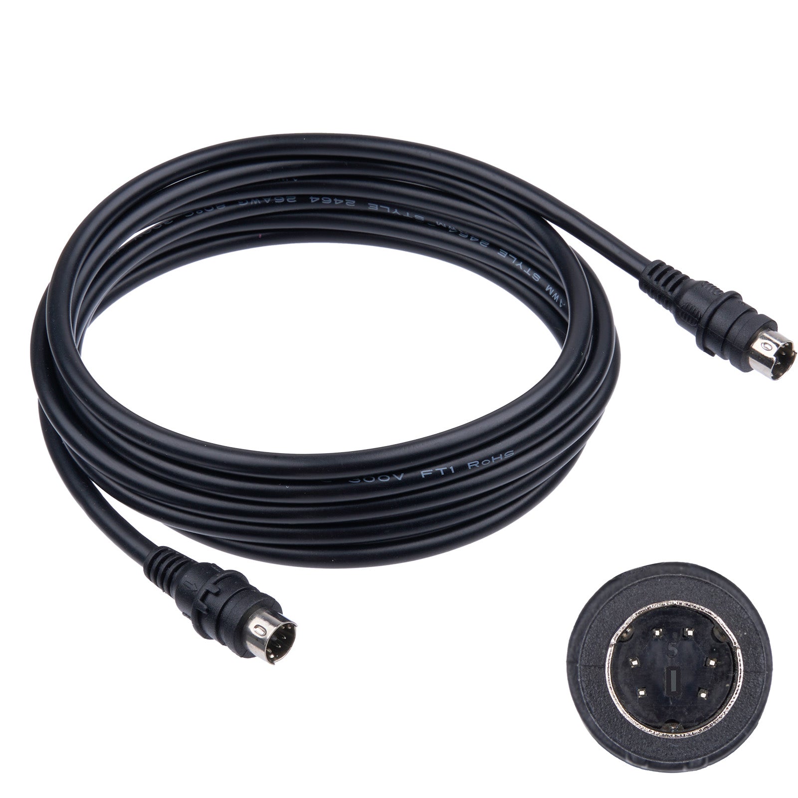 - The sync cable has a round 6-pin male plug at both ends and a guide post in the middle of the plug.