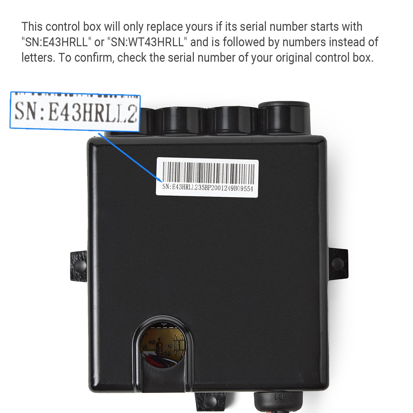 - This control box will only replace your original control box if its serial number starts with "SN:E43HRLL" or "SN:WT43HRLL" and is followed by numbers instead of letters. To confirm, check the serial number of your original control box before purchasing.