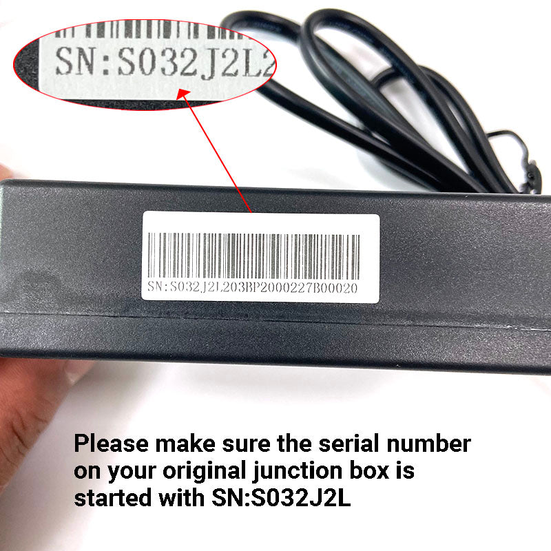 To decide if this junction box can replace yours, please check your original junction box, find the barcode sticker, and check if the serial number on the sticker is started with SN: S032J2L (please refer to the following image):