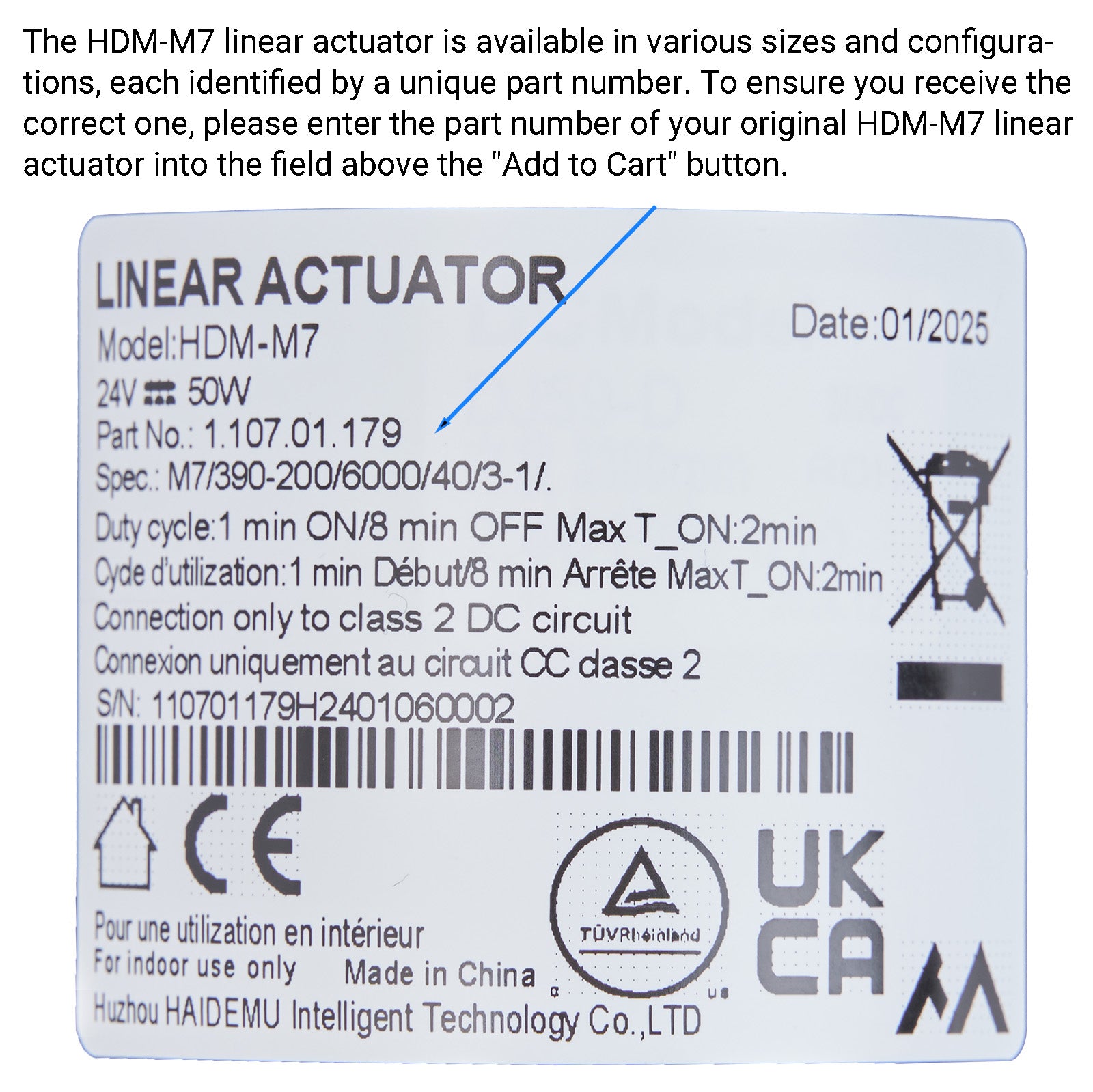 The HDM-M7 linear actuator is available in multiple sizes and configurations, each with a unique part number. To ensure compatibility: