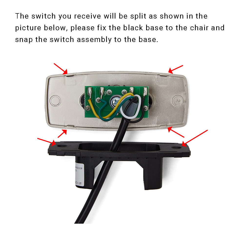 - The switch will be shipped split, when installing, please fix the black base to the chair, and snap the switch assembly to the base.