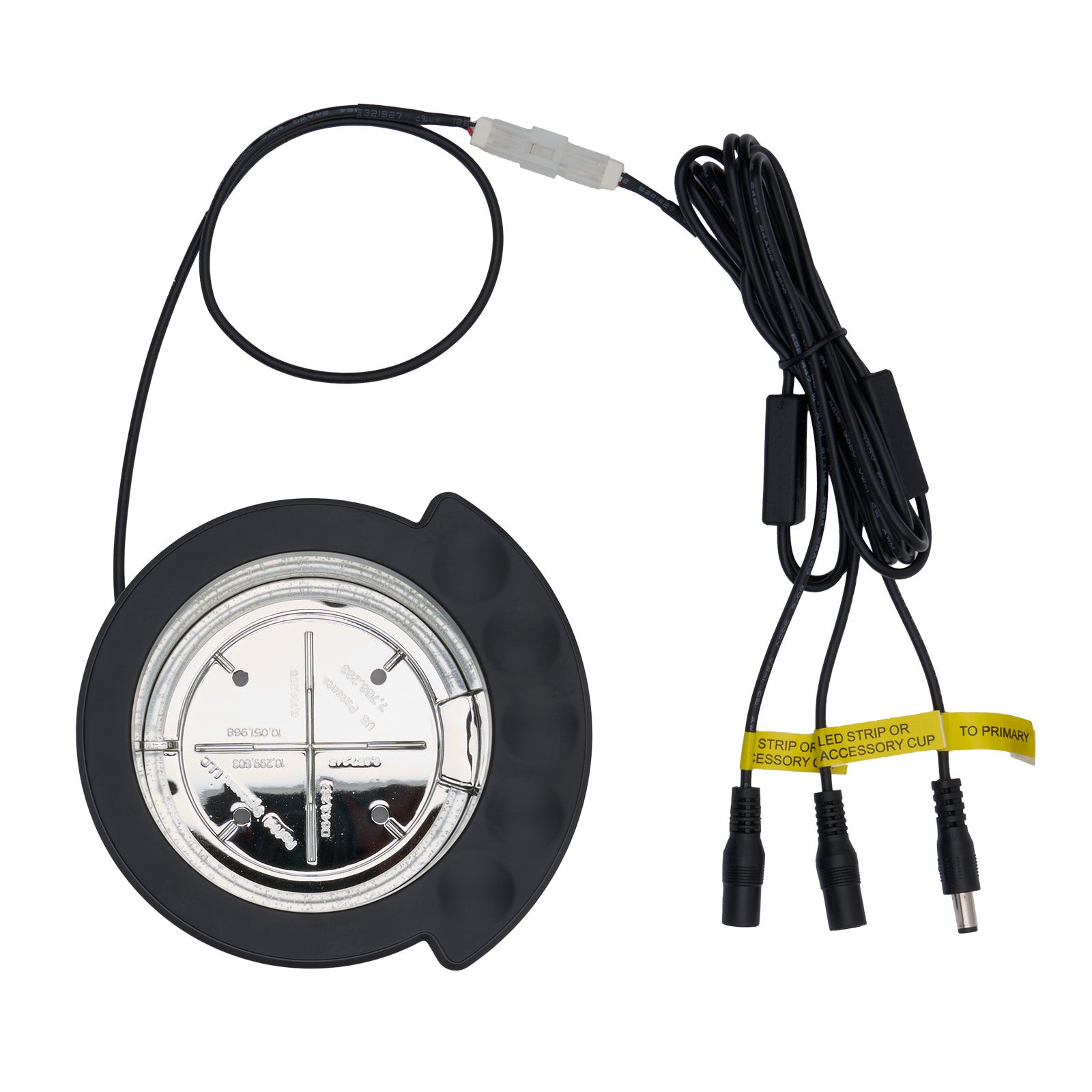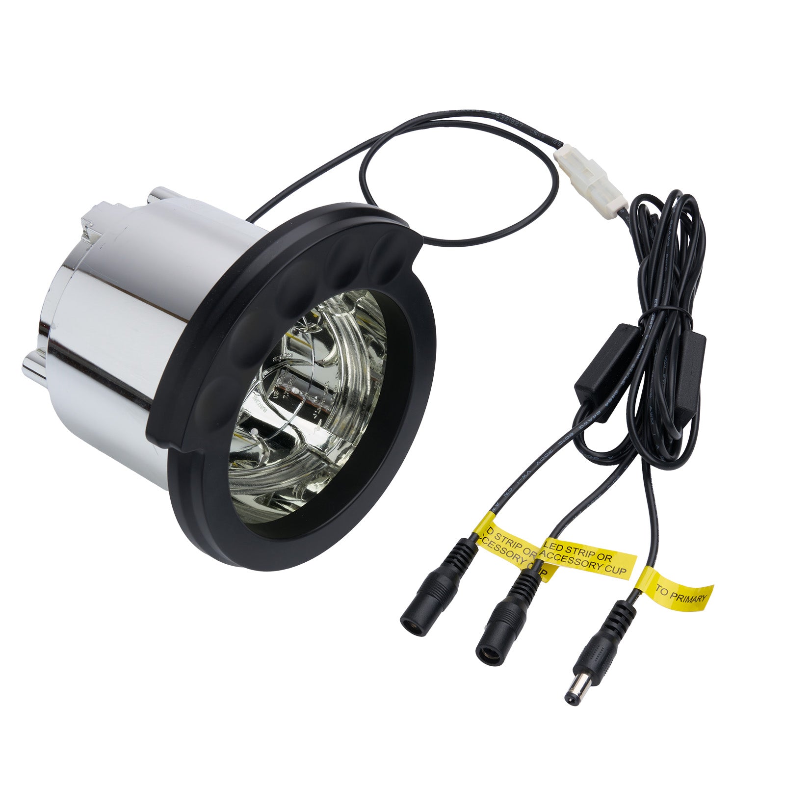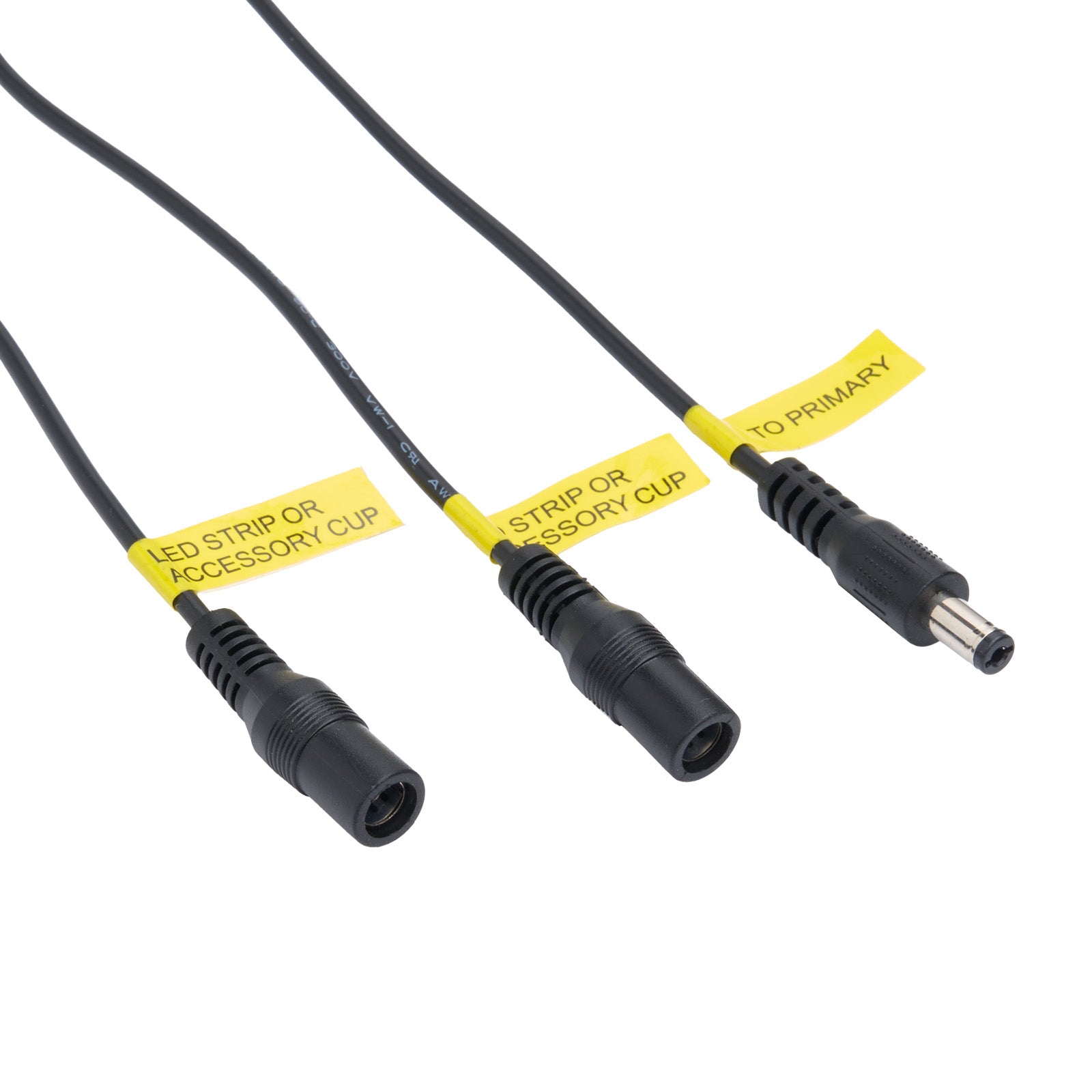 - Two female barrel plugs for connecting LED light strips.